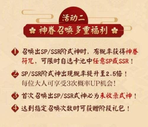 1月20日春节版本更新后,在活动卡池召唤出SP/SSR阶式神时,有概率获得神眷符咒,可限时自选卡池中任意SP或SSR !