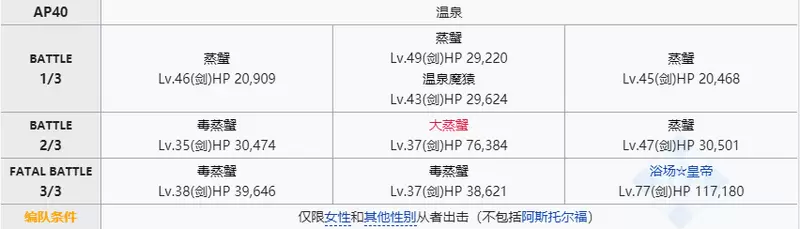 仅限女性/其他从者出击(阿斯托尔福无法出战)。