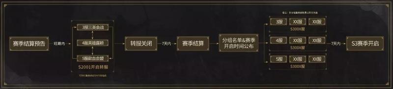 3. 转服功能关闭后7天内,进行赛季结算。赛季结算后将会公布S3赛季服务器分组名单以及S3赛季开启时间,同时将开启跨服聊天频道(处于同一S3赛季大区分组的玩家,将能通过跨服聊天频道进行交流)。