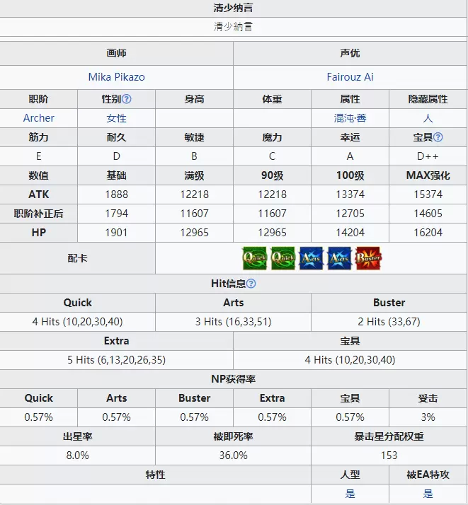 HP在五星弓阶垫底,ATK也只是排在第五位。不过清少纳言是目前五星弓阶中唯一一位绿卡宝具从者。