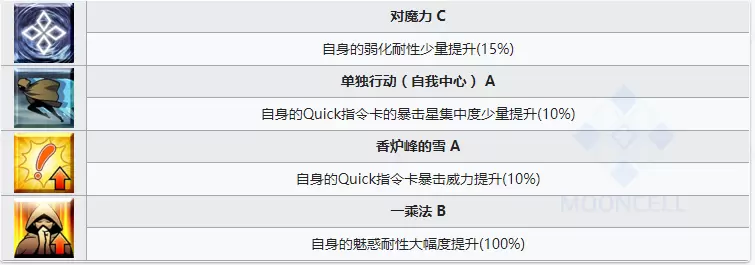 进一步提升蓝卡性能的被动技能,但是和上面白值提到的问题一样,宝具回收过低的情况下这也只是给平A和宝具伤害一些加成罢了。