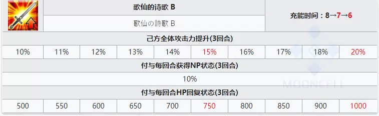 己方全体攻击力提升10%~20%(3回合),赋予每回合获得10%NP状态(3回合),赋予每回合HP回复500~1000状态(3回合)。