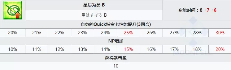 自身的Quick指令卡性能提升20%~30%(3回合);NP增加10%~20%;获得暴击星10。