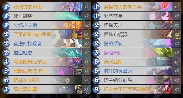 在后期拍下塔卡恒后,这套牌就化身了进攻者,可以凭借高级跟班、鸦羽和(宇宙后的)红龙打出三波大攻势,同时如果有发现牌的跟班还能补充一波资源,任务提供的过牌和减费也增加了卡组的稳定性和上限。如果为了完成任务,尽量把情势反转留到8张手牌左右时再打出,而且别忘了情势反转可以配合莫瑞甘的灵界加速过牌。