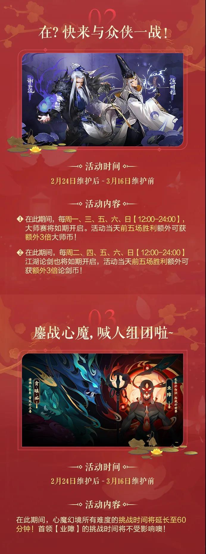 2月24日维护后-3月16日维护前,大师赛每周一、三、五、六、日【12:00-24:00】开放,江湖论剑每周二、四、五、六、日【12:00-24:00】开放,每天前五胜可获额外三倍大师币/论剑币哦!还有心魔限时延长挑战时间。