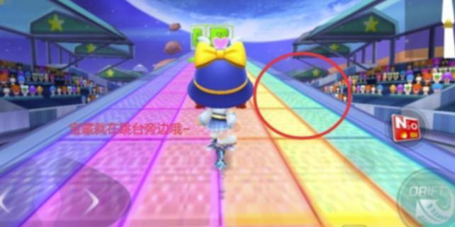 任务明确告诉我们宝藏在“加速带附近”,所以我们在跳上加速带之后不要开太快,看见宝箱吃掉即可,宝箱位置如下图。