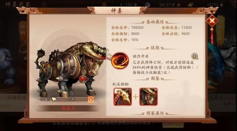 金神兽的回报从神木青鸾就可以看出,是肉眼可见的高—— 一只白板裸神兽可提高千万的战力。而撼地灵犀和神木青鸾相同,单只都可以给阵容提高百分之三十的生命(其他固定数值暂且不提),两只在各自提升百分之三十生命后,图鉴完成还可提升一定面板,可以让一个不起眼的中游玩家异军突起。