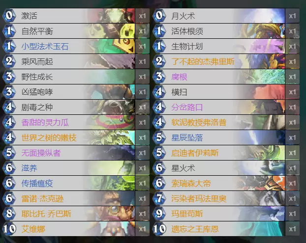 之所以选择野性成长而不是青玉绽放,一是因为10费打出能抽牌,而且给的那张0费的抽牌也可以被伊利斯复制,比较灵活,二是青玉绽放可能会卡格子,见仁见智。