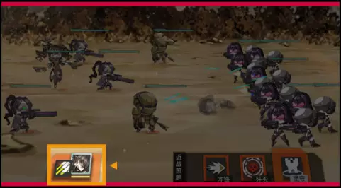 冲锋:近战单位会在当前位置径直前进,并攻击路径上的敌方,直到我方消灭完索敌范围所有敌方时,继续随团队向前行军至再次遇敌或行军至索敌范围尽头。