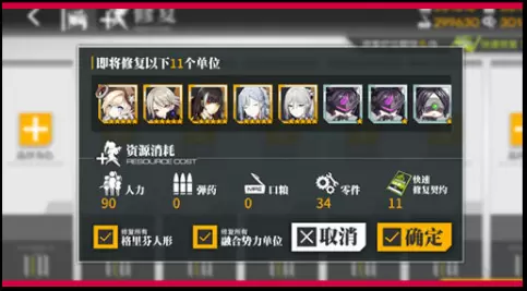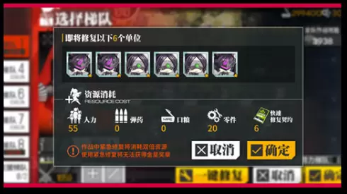 融合势力单位在作战中受损,可以在机场需要消耗人力、零件、时间或快速修复契约进行键修复, 也可对某一单位单独进行修复。