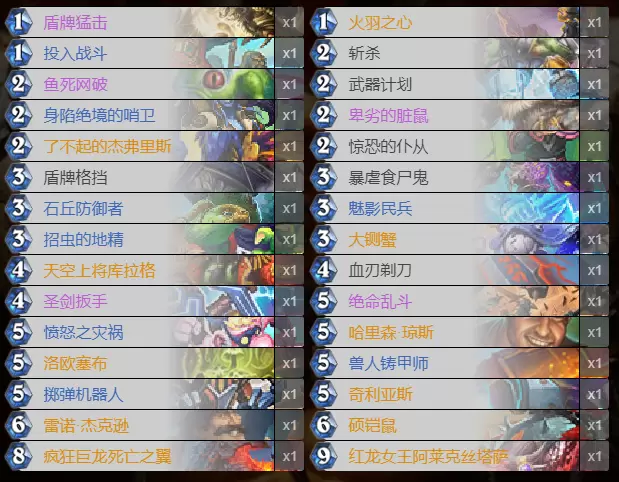 整体来看这套牌打大部分快攻和宇宙卡组都是小优,如果带上完整的炸弹体系可以做到大优于宇宙开门法。推荐喜欢战士的小伙伴尝试。