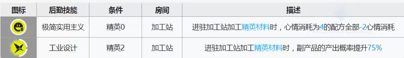 进驻加工站加工精英材料时,心情消耗为4的配方全部-2心情消耗。