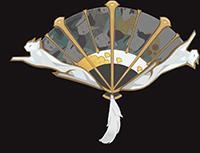 扇子边骨是立体的狮猫外形,芯骨使用了金色质感的材料提亮,扇面隐约可见与服饰呼应的暗纹,扇钉则使用了猫尾元素,收拢后又形若一只猫。