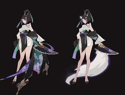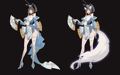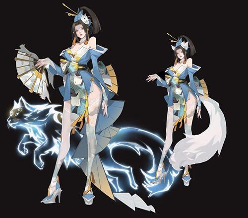 在备选方案中,该方案采用了更具时尚感的扇形剪裁与蕾丝搭配,用清爽柔和的蓝白配色混合张力十足的橘黄色,优雅的装扮配上犀利的服饰剪裁,很好地呈现出不知火舞“魅力女刺客”的角色风格,也成为了最终选择的皮肤方案。