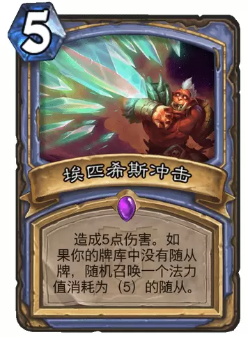 卡牌效果:造成5点伤害。如果你的牌库中没有随从牌,随机召唤一个法力值消耗为(5)点的随从。