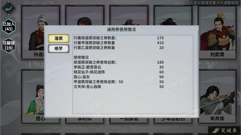 版本更新之后,在侠客界面的右下角,新增了查看通用券使用情况的按钮,点击即可查看当前行囊中突破券数量和已使用详情。