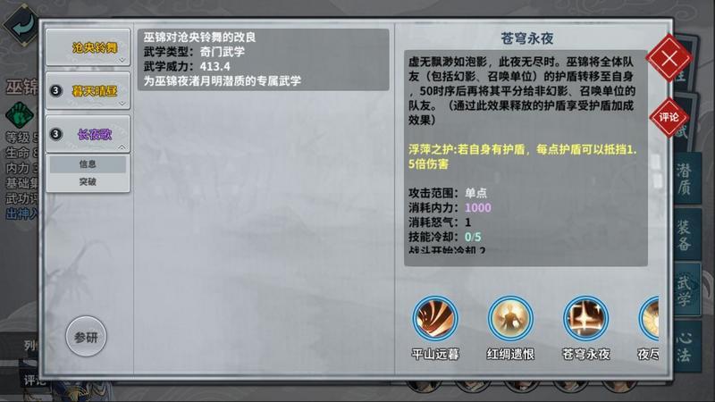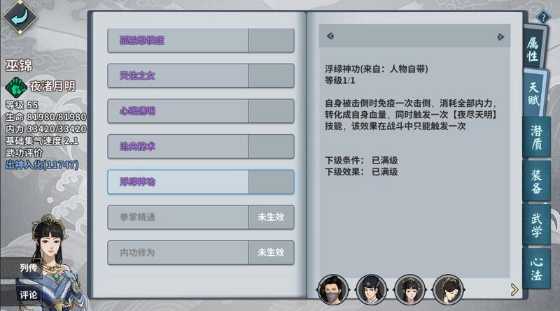 《汉家江湖》巫锦夜渚月明潜质介绍 浮绿神功及长夜歌武学一览