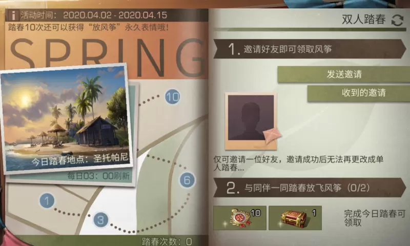 累积踏春满10次可获得“放风筝”单人动作及配方残页*20奖励。