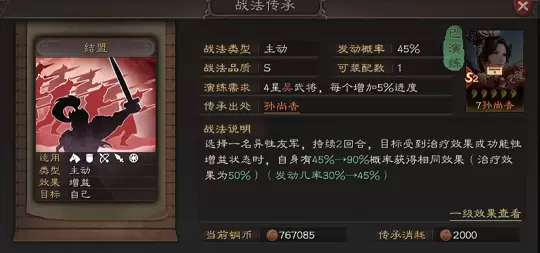 传承战法【结盟】:主动战法,45%发动几率,随机连接一名异性友军,目标受到功能性增益状态或治疗效果时,自身也有90%几率获得相同效果(治疗效果为50%)。功能性增益状态的获取机制同【弓腰姬】,必须是【结盟】发动以后获得的功能性增益状态才有效。