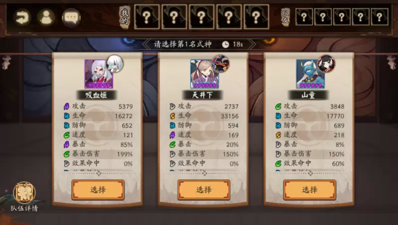 每场挑战开始后,大人需与队友各选取5名属性和御魂已确定的式神,作为本局挑战的队伍。