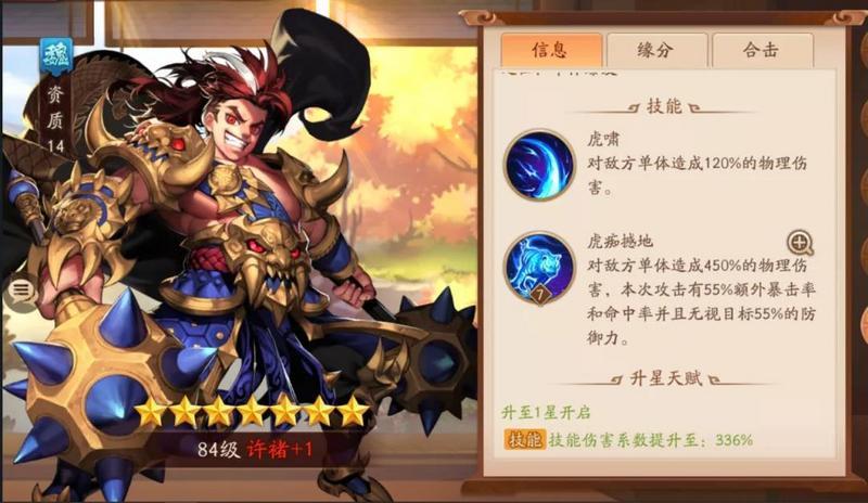 低星时命中率很是堪忧,据魏国大佬说星级高了是神将,输出和控制强到爆炸。不过小编只是平民玩家,没有具体数据做支撑,所以暂时不过多介绍,但典韦目前依旧可以作为副c使用。