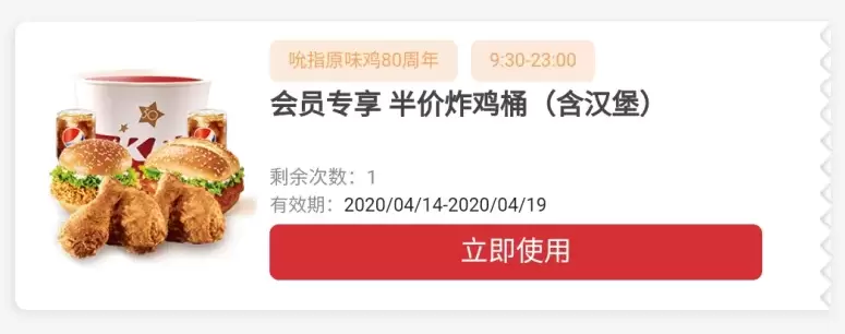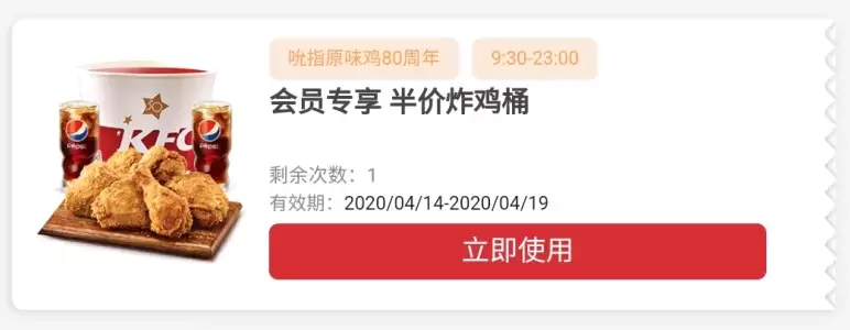每个会员ID仅限获得 1 张优惠券,优惠券仅限使用 1 次,核销后即失效,每单仅限使用一张。券使用规则详见“我的卡包”券说明。不适用于肯德基宅急送。不与其他优惠共享。产品及包装以实物为准。