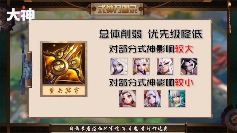 对于鸩,百目鬼,青行灯这类,需要攻速,且不依赖攻击面板的式神,重矢冥穿的削弱影响较小。