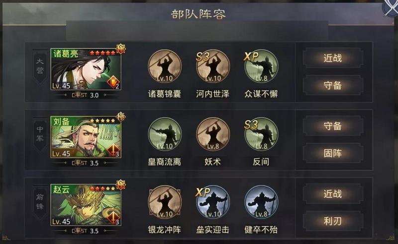 前锋赵云,全攻击加点。战法【垒实迎击】【健卒不殆】,不是很怕普攻流的菜刀队。