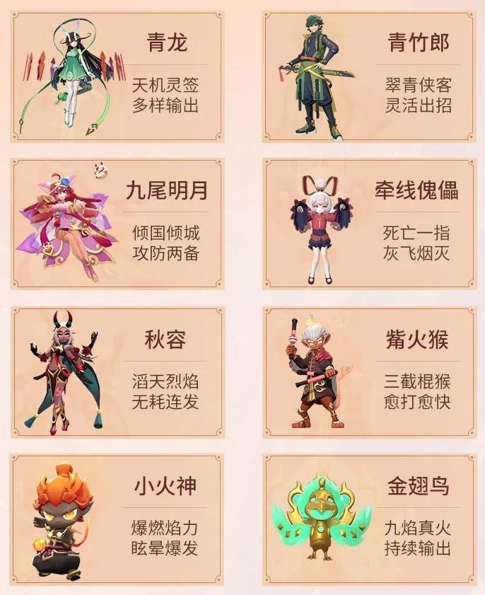 青龙、青竹郎、九尾明月、牵线傀儡、秋容、觜火猴、小火神、金翅鸟。