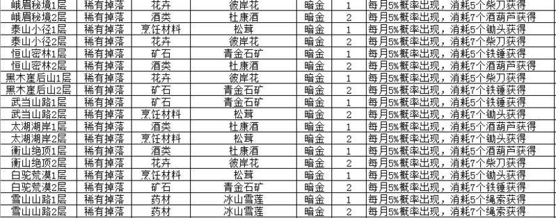 迷宫拾取这就是很方便了,在练级和做事件的过程中来收集材料,且每个迷宫都固定了材料种类,值得注意的是每个迷宫的刷新CD也是一个月;另外特别的材料还需要在迷宫中使用特定采集道具来采集,下表是部分特定采集材料与需要的物品列表: