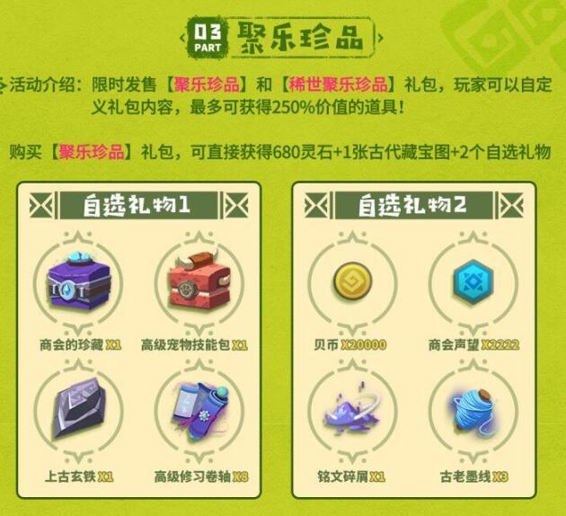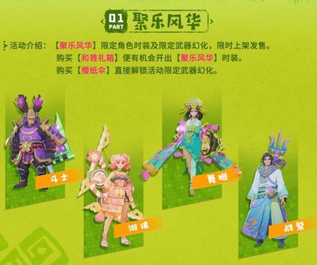 本次活动将推出【聚乐风华】限定角色时装及武器幻化,更有最高价值250%回报的超值礼包和海量活跃宝箱等你来拿!