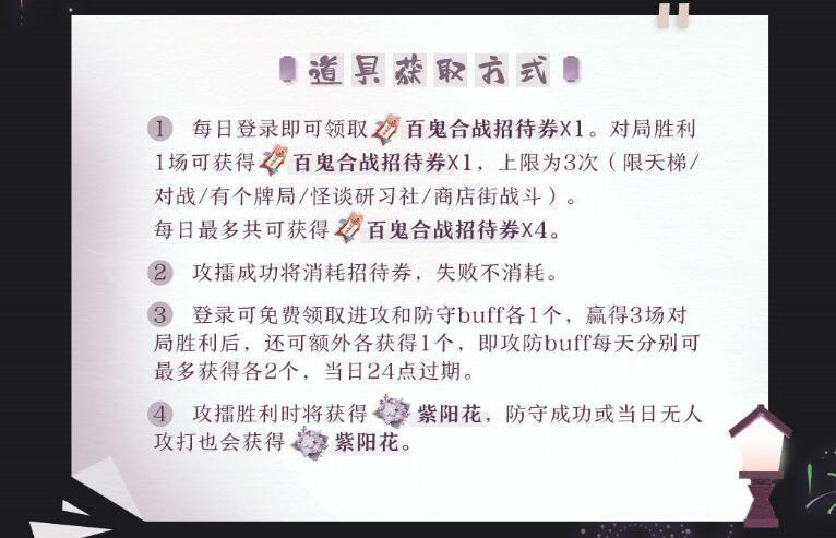 客人们进入百鬼合战大会后,将看到随机的三个对手;可选择其中一位对手进行攻打,如果进攻胜利可以获得紫阳花;守擂时可自由设置阵容,若防守成功也可获得紫阳花。