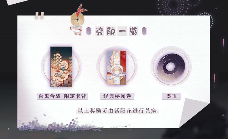 百鬼合战限定卡背、经典秘闻卷、墨玉(需要紫阳花兑换奖励)。