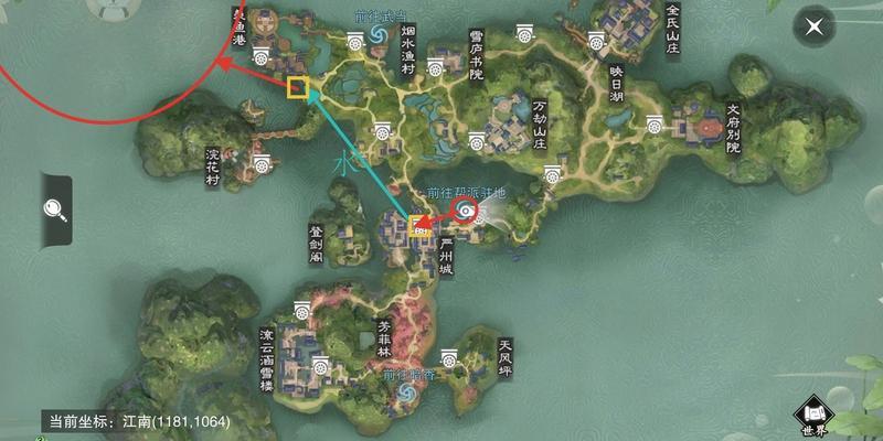 ■返程(边界传送):红色路线为咸鱼港到严州:直飞大红圈会4秒读条送回小红圈。利用超出地图边界会回出生点的原理,而边界就在咸鱼港,出生点就在严州。所以咸鱼港飞边界,出生点飞严州。