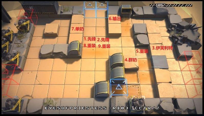 5.重装。说是重装位,其实用柏喙/崖心等技能带有眩晕的干员也行,目的是打断冲锋哥的加速。如果带了二技能红或者2号先锋是德克萨斯的情况下也可以用它们来打断冲锋哥,此时这里随便摆个近战就好了。