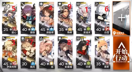 注:除了上述9个干员,还需要至少一个快速复活特种来唤醒右边的敌军,此外推荐带法术近卫削减大锤血量,或者开局快速攒费的法国干员,银灰真银斩、艾雅法拉火山这种决战技能,2技能红增加容错。