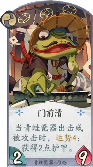 门前清:2勾玉的神卡,每次受到伤害前都会判定,搭配上原有的9血可以有效站场。