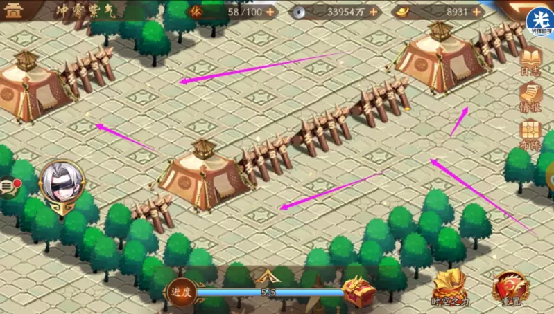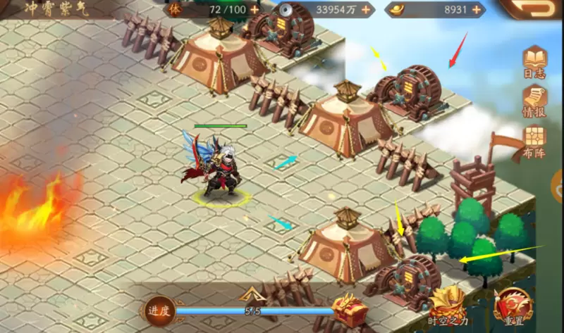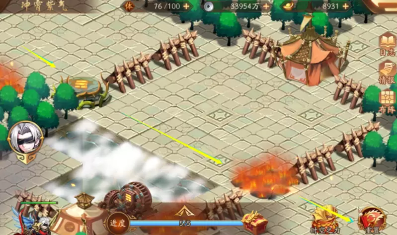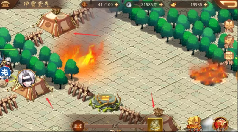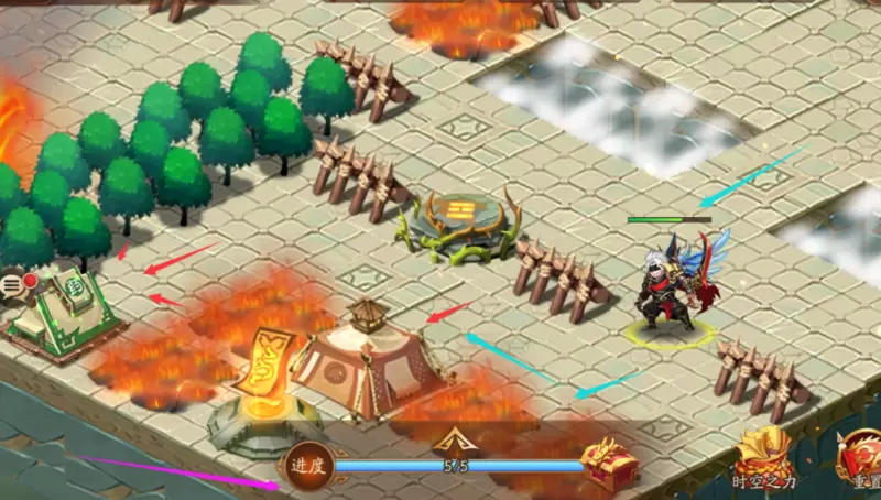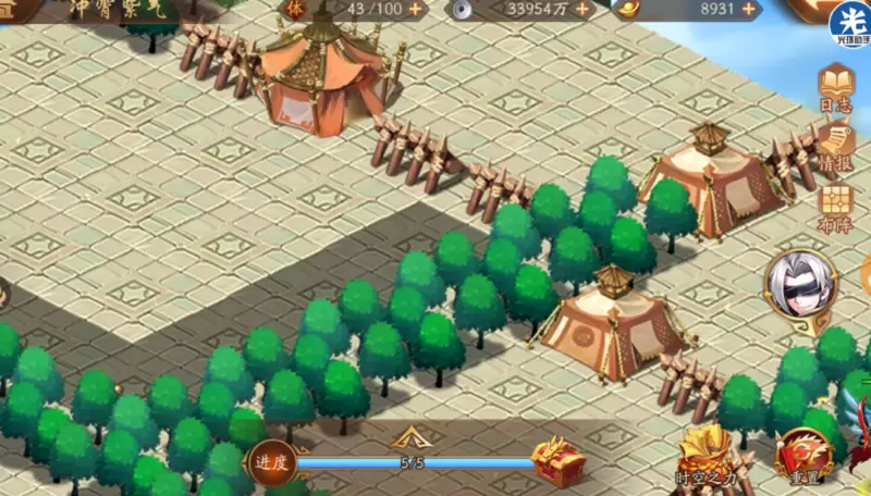 由此进入,绿荫中央我们将面对的是三个帐篷,依次把两个帐篷干掉。利用回血的buff达到把自身血量建立在优良的情况,再靠刷出来的紫色时空之力再加buff继续推关。