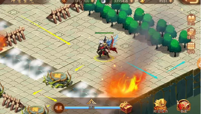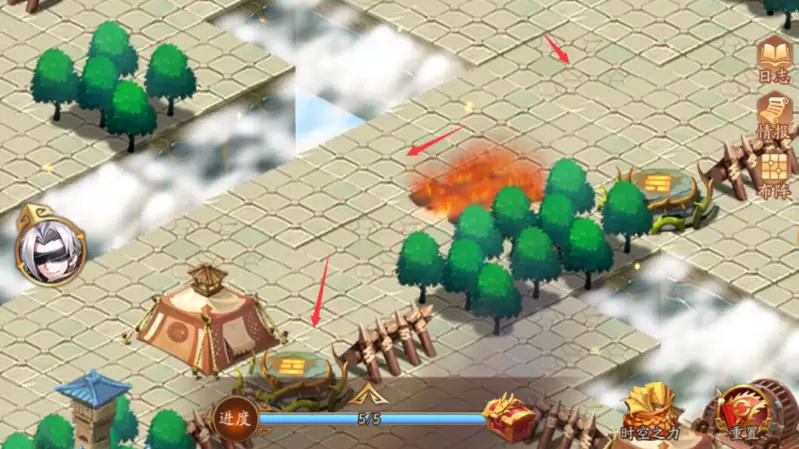 绕过树藤缠绕闪闪发光瞩目的陷阱,分别攻打箭头指向的帐篷就能去打开中上方的机关,这是第一个机关,打开之后左边的路置放的陷阱就会消失。