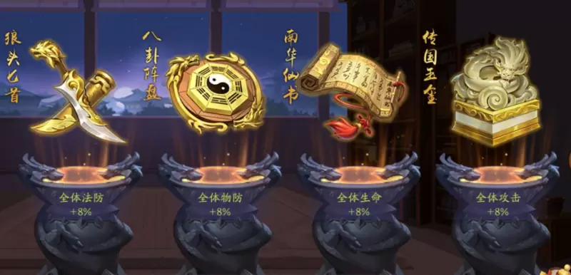 时空外传的增益,随着敌人的强弱来提升。前面的敌军实力较低,击败后给予的帐篷是紫符,所以我们选济弱,后面橙符选承天之祐和震慑八方(降低敌方攻击),最后两个则优选生死羁绊,其次选择变猪也不错。