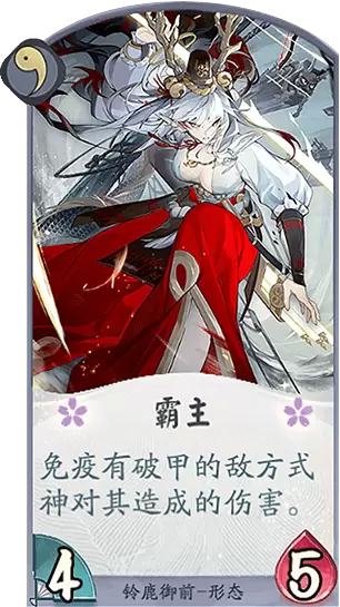 卡牌评价:霸主的能力在很多时候作为一种防御手段更加有效。想要2段伤害解掉霸主形态是比较难的。