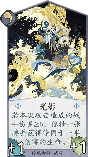 效果:若本次攻击造成的战斗伤害≥6,你抽一张牌并获得等同于一半伤害的生命。