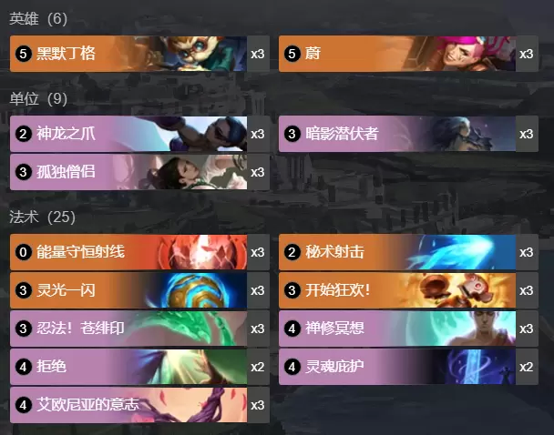 4费:禅修冥想x3,拒绝x2,灵魂庇护x2,艾欧尼亚的意志x3