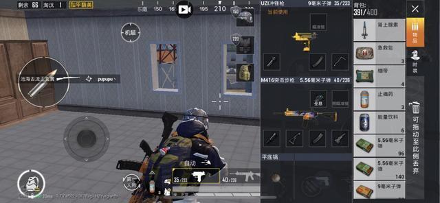 上分的过程中,要将背包的空间最大限度地利用起来,子弹带上400发左右,M416带200发左右,UZI带200发足够了,如果是M762的话带100发左右也够了,因为9毫米子弹在后期很难补充,762的子弹可以从敌人包里舔;药品的话带上3个急救包、5瓶饮料、3个止痛药就足够了,条件允许的话可以带个医疗箱和肾上腺素;手雷和烟雾弹要各带3个,能用手雷解决的战斗,尽量不要用枪去解决,不仅浪费子弹,而且还很容易将自己带入危险之中,烟雾弹的作用是用来撤退和构筑掩体,必须要带。