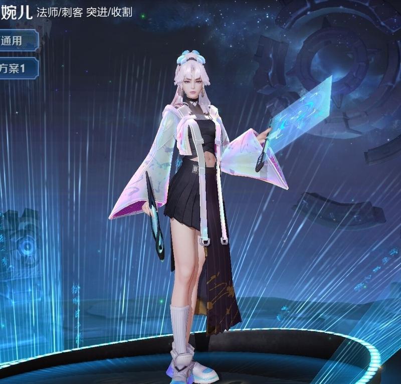 白色的长发搭配大耳环,身穿大袖子衣服,看起来非常有气质,长短不一的黑裙更加现代化,可以说天狼绘梦者皮肤就是按照现代元素设计的一款新皮肤,手里拿的不再是带着墨水的毛笔,而是一把毛笔样的武器,看起来非常尖锐和锋利。