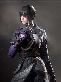 图中的夜莺,束起的黑发干净利落,紫色手套显露一丝神秘气息,给人的第一感觉似乎是名不喜欢言笑的女军官。作为战场中的一员,她显得十分沉着冷静。