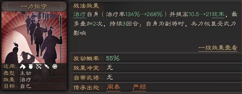 55%的发动概率,瞬发,副将受武力影响。超级治疗,物理版的刮骨疗毒,说是起死回生的治疗战法也不为过。