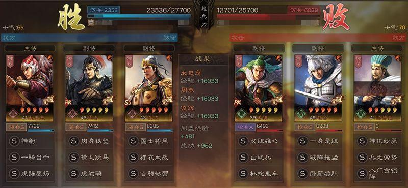 主将用太史慈、孙尚香亦可。有阵营加成,又有凌统和周泰两位伤害增幅,再搭配横戈跃马,是一种推崇极致爆力的队伍。在45级的情况下,仅凌统周泰的增幅就轻松达到80%。