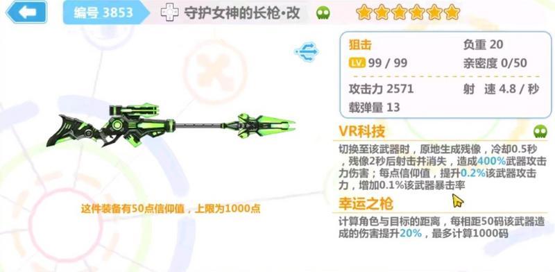 VR科技:切换至该武器时,原地生成残像,冷却0.5秒,残像2秒后射击并消失,造成400%武器攻击力伤害;每点信仰值,提升0.2%该武器攻击力,增加0.1%该武器暴击率。
