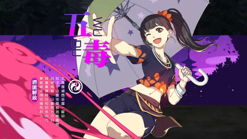 五毒专精以控制毒蛊而闻名于世,她的技能以毒和蛊来划分,分别可对敌人造成毒和蛊的持续伤害,当这两种伤害附加在同一目标时会引发爆炸造成叠加伤害。